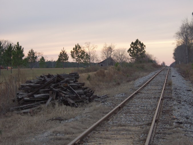 Sun was setting, the end of a long day touring back roads in South Georgia, headed for our overnight lodgings in Cordele. Doc was compelled to stop and shoot by hand this picture of a pile of railroad ties.